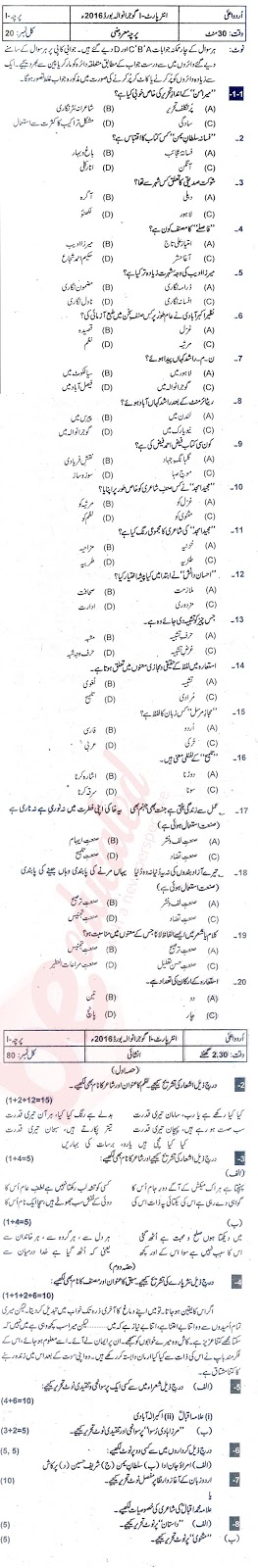 • 2016 FSC (11th Class) Urdu Past Papers Gujranwala Board