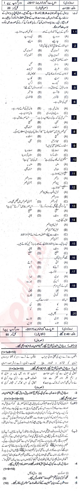 11th Class Urdu Past Papers BISE Gujranwala Board Download Pdf