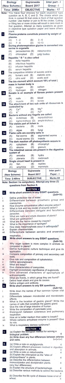 - 2017 FSC (11th Class) Biology Past Papers Gujranwala Board