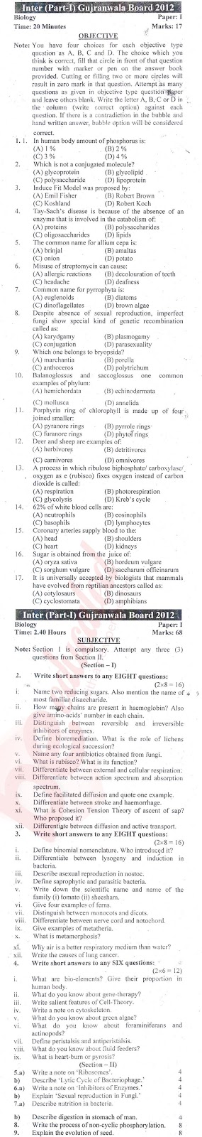 - 2012 FSC (11th Class) Biology Past Papers Gujranwala Board
